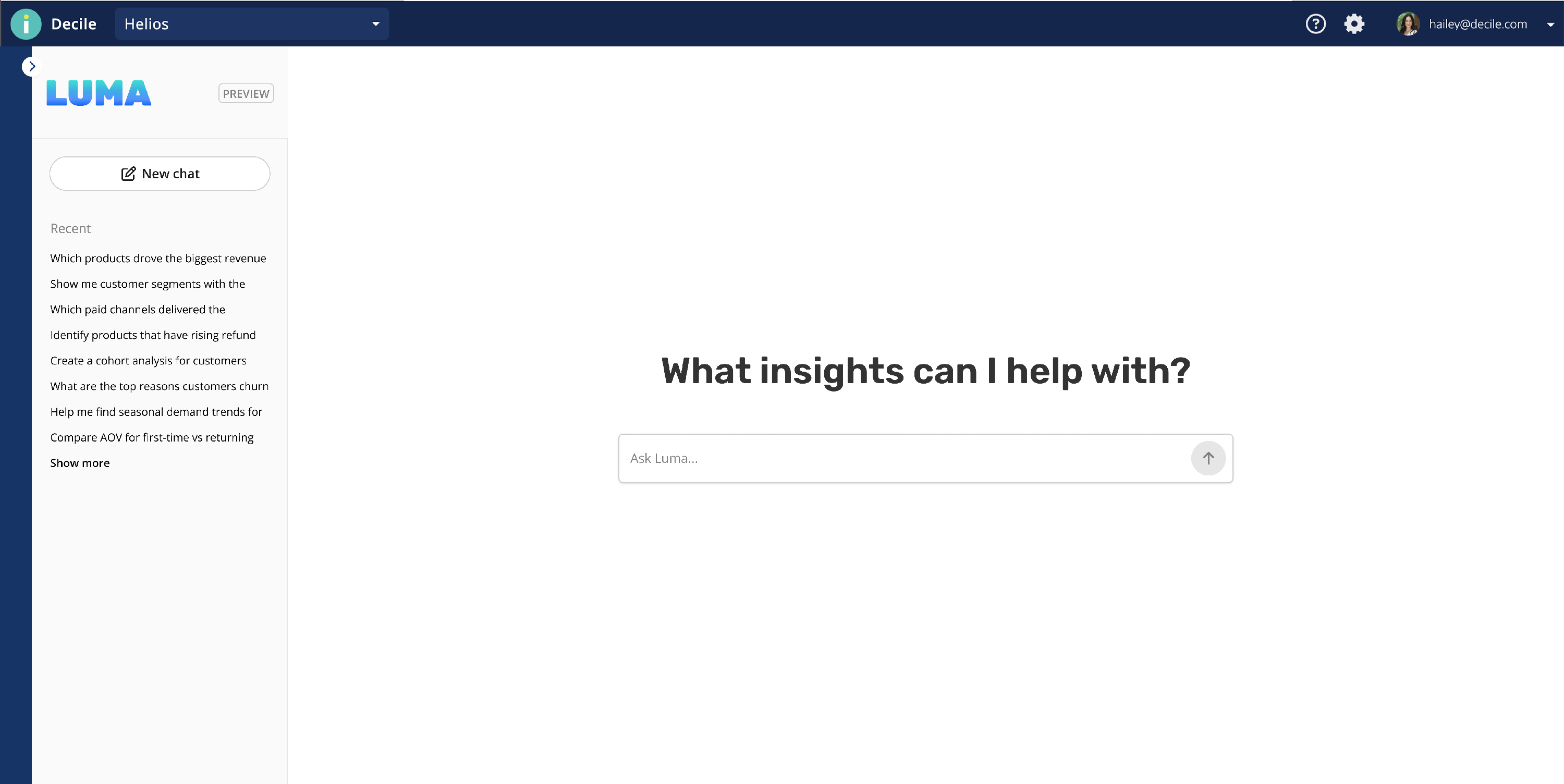Luma is available to all Decile customers and can be enabled directly inside your Decile account. Follow the steps below to opt in and start using Luma for ecommerce analysis and insights.